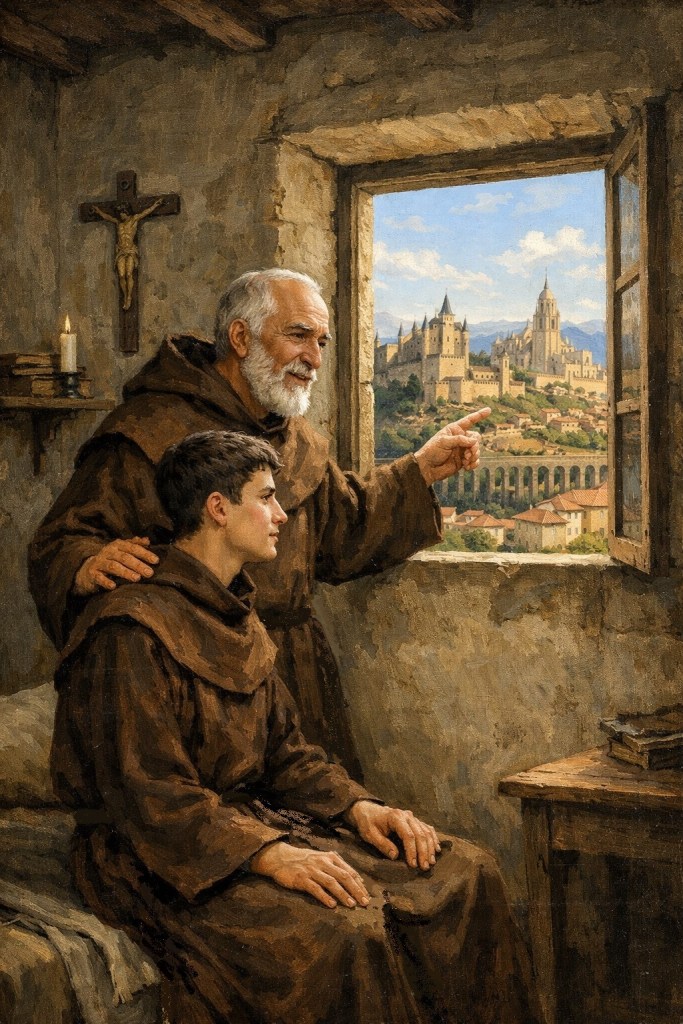 Giovanni indicò due cose: la Bibbia e la finestra della sua cella. La Parola scritta, disse, conteneva tutto ciò che Dio aveva voluto comunicare; la finestra, invece, mostrava il Creato, un “libro” nel quale la voce di Dio si faceva visibile e tangibile. Dal paesaggio spagnolo, colline, boschi, cielo intenso, il giovane imparò che le creature non parlano per sé, ma riflettono il volto del Creatore. Ogni fiore, ogni tramonto, ogni albero è “vestito di bellezza” per mezzo della figura del Figlio, il Verbo incarnato che conferisce ordine, grazia e dignità a tutto ciò che esiste. In questo modo, la contemplazione del creato diventa una forma di ascolto della rivelazione divina, capace di accompagnare e approfondire la meditazione della Scrittura.
