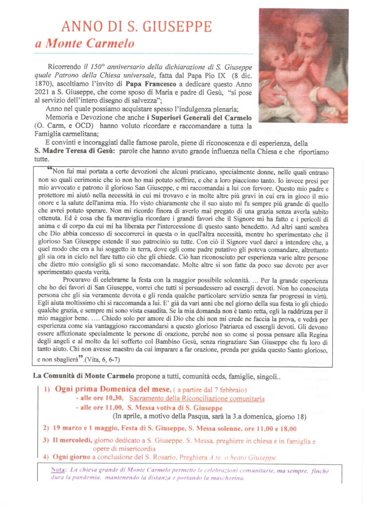 Per meditare in maniera più approfondita la Spiritualità di S. Giuseppe si possono studiare la Lettera Apostolica di papa Francesco “Patris Corde” e la Lettera inviata dai nostri Padri Generali Carmelitani “Il Patrocinio di S. Giuseppe sull’Ordine Carmelitano”.
