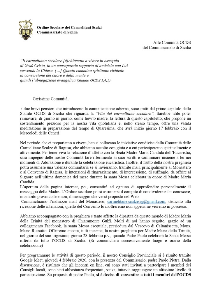 L’OCDS (Ordine Secolare Carmelitani Scalzi) in Sicilia non si lascia bloccare da questa dolorosa pandemia e – in attesa di tempi migliori – offre alle nostre fraternità diverse occasioni d’incontro con i mezzi di cui la maggioranza dei membri dispone (cellulari, personal computer, ecc). Alleghiamo la lettera della Presidente ai membri delle fraternità e agli assistenti, sperando di allargare la conoscenza e la partecipazione alle varie iniziative.