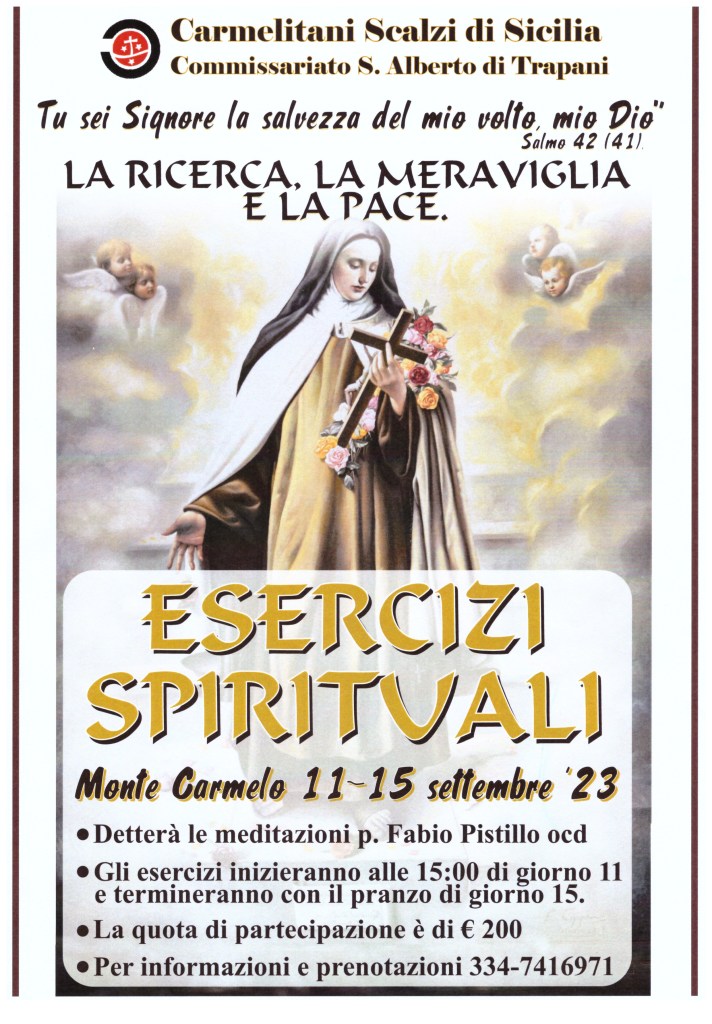 Come ogni anno la nostra Casa di Preghiera, dall’11 al 15 settembre, ospita gli Esercizi Spirituali guidati dal nostro P. Fabio Pistillo che ci accompagnerà sulla via tracciata da S. Teresa di Gesù Bambino.