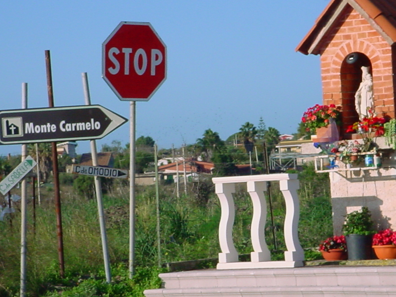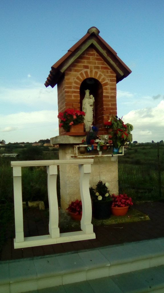 - Oppure con l’autostrada Catania-Siracusa uscendo all’indicazione “Augusta-Villasmundo” e proseguendo verso Villasmundo fino a una cunetta con l’edicola della Madonna sotto raffigurata.