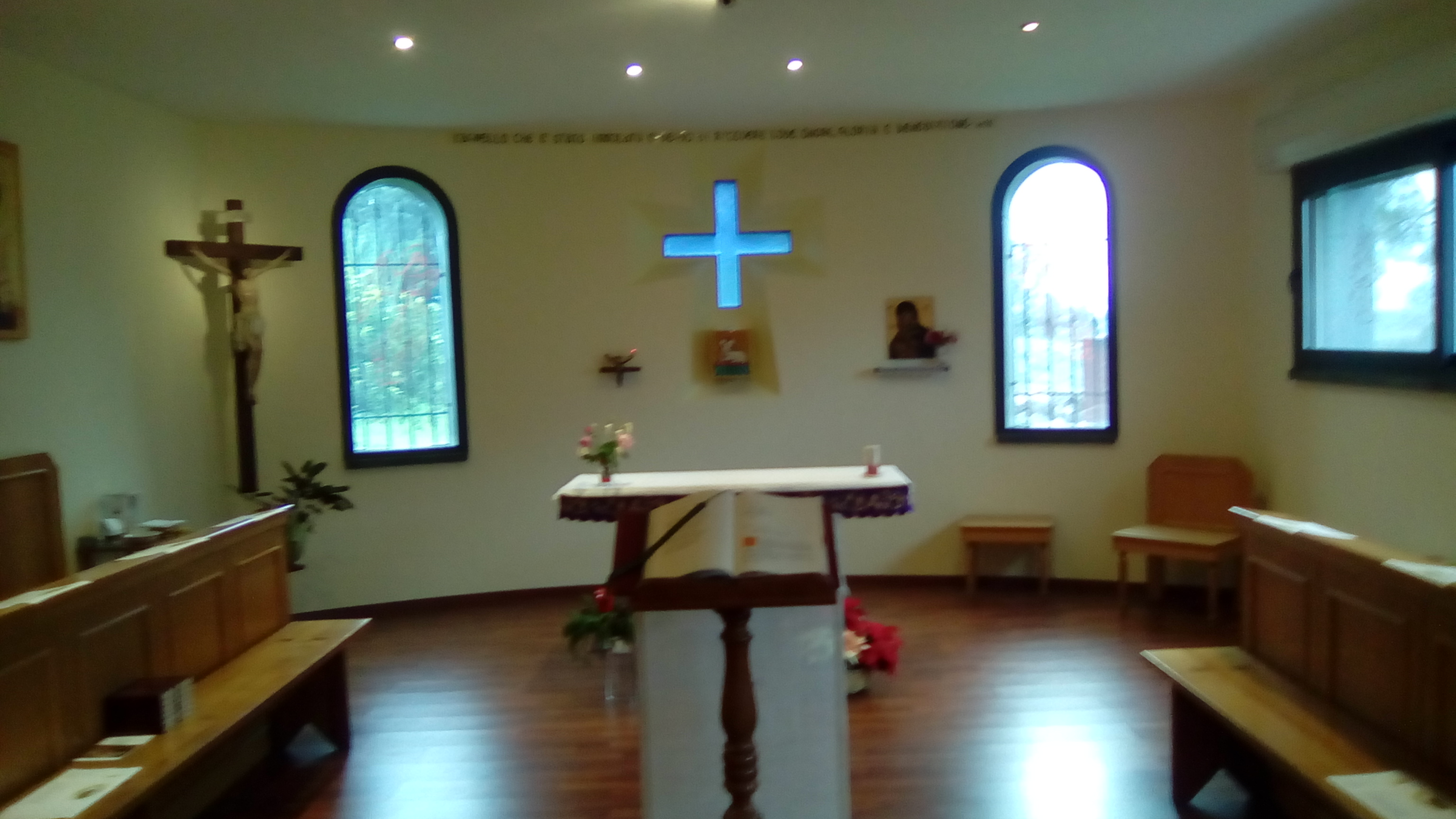 Nella Cappella media dietro all’altare abbiamo un pannello che rappresenta artisticamente la Salita del Monte Carmelo come è stata ideata da S. Giovanni della Croce. Due ampie strade salgono deviando verso l’esterno, un solo ripido sentiero sale alla vetta dove attende il volto amabile di Gesù. Molte cose belle e positive della vita scandiscono le due strade ampie che non riescono a raggiungere la vetta, per ricordarci che esse in sé non hanno consistenza se saziano il desiderio di chi ascende e lo distolgono dal raggiungere la vetta.