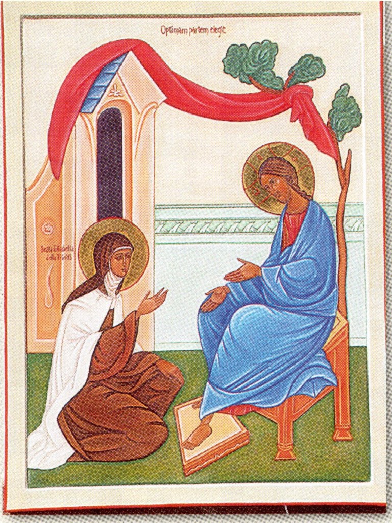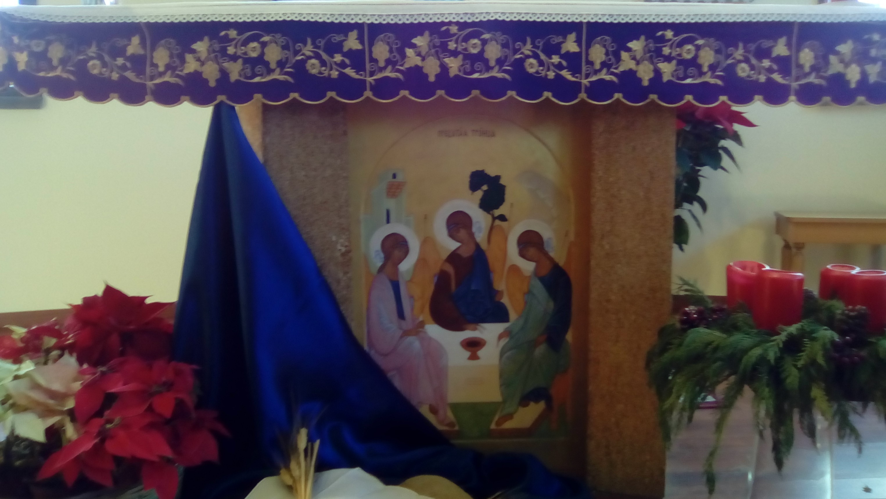 Nella Cappella del Convento invece abbiamo, sotto la mensa dell’altare e visibile da tutta l’assemblea, l’icona della Trinità a gloria della quale si celebrano le liturgie della Comunità.